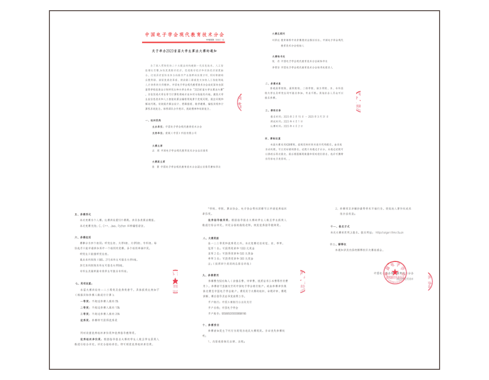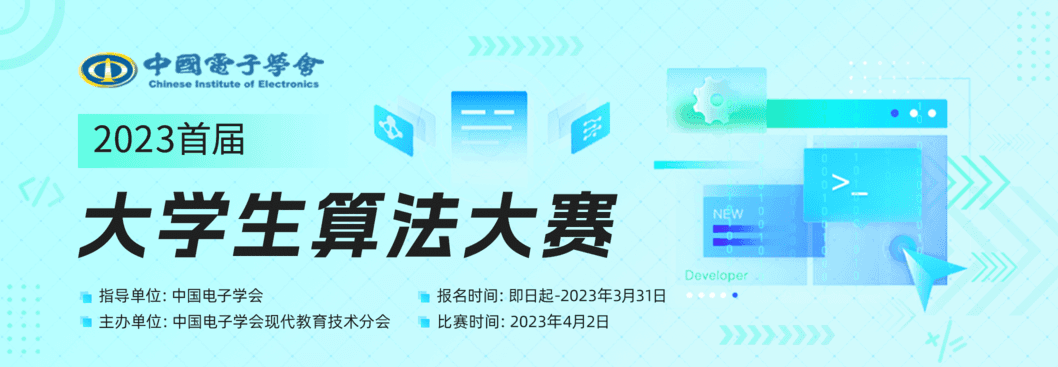 为了深入贯彻党的二十大提出的构建新一代信息技术、人工智能增长引擎,加快发展数字经济,促进数字经济和实体经济深度融合,打造具有国际竞争力的数字产业集群的政策方针,同时积极响应教育部、国家发展改革委、财政部三部委发文加快人工智能领域人才培养的文件精神,中国电子学会现代教育技术分会决定面向全国高等学校在读全日制研究生和大学生举办“2023首届大学生算法大赛”,旨在促进大学生学习计算机领域专业知识与技能的兴趣,激发大学生在信息技术和人工智能的算法编程领域勇于发现问题、提出问题和解决问题,有效提升算法设计、逻辑推理、数学建模、编程实现和计算机系统能力,培养团队合作意识、挑战精神和创新能力。