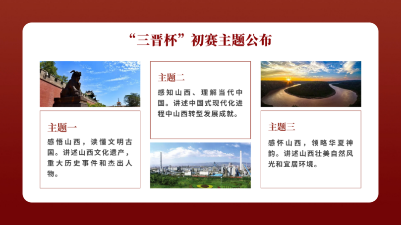本次大赛主题内容围绕“讲好山西故事”,涵盖山西省自然和文化遗产、古今人物,新时代经济社会发展成就等内容。本次大赛初赛主题已公布: