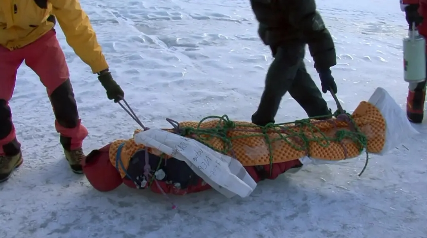 第二天,他们继续用绳索,缓慢、艰难地把这两具遗骸往山下运。因为冰冻的原因,一具遗体的重量就达到200多斤,这无疑更增加了搬运难度。