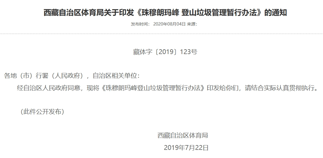 2018年,西藏珠峰登山季结束,西藏环保大队在海拔5200米以上的珠峰地区进行4次大规模垃圾清理行动,共清理完成近10吨垃圾。