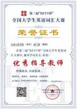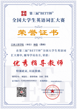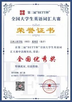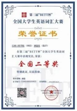 近日,在刚刚结束的第三届”BETT”全国大学生英语词汇大赛中,经过激烈的角逐,我院学生积极参与,共荣获全国一等奖1项、二等奖1项、三等奖3项的好成绩,并获得了组委会颁发的获奖证书。
