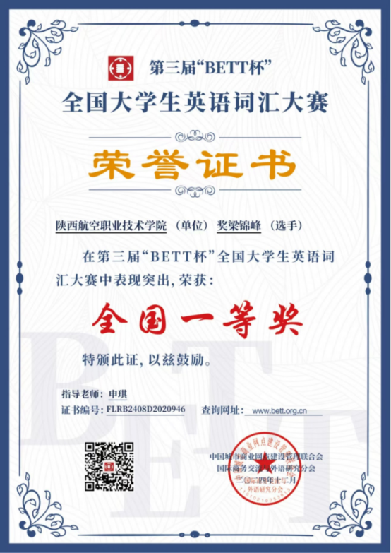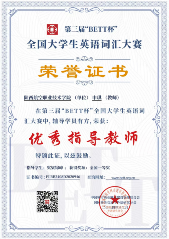 近日,第三届“BETT杯”全国大学生英语词汇大赛结果公布,我院工业机器人技术专业学生梁锦峰喜获得全国一等奖,申琪老师获得优秀指导教师称号。