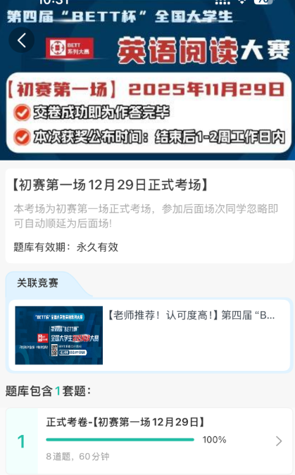 根据《第四届“BETT杯”全国大学生英语阅读大赛考试》要求,现“BETT杯全国大学生英语系列大赛组委会”针对初赛第一场(2025年11月29日)线上考试考场安排如下: